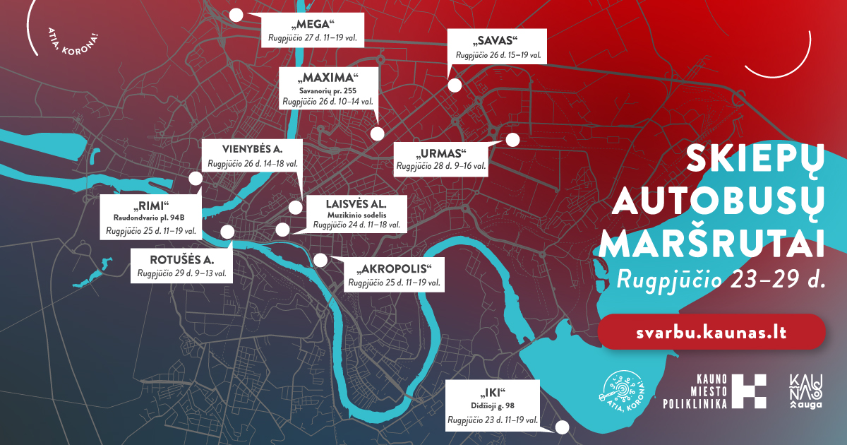 Mobilūs vakcinavimo centrai, kuriuose dirba Kauno miesto poliklinikos komandos, nepailsdami kursuoja po Kauną ir laukia visų skiepą nuo COVID-19 ligos gauti norinčių gyventojų. Rugpjūčio 23–29 dienomis „vakcibusai“, be jau įprastų sustojimų, aplankys Vaišvydavos bei Raudondvario plento gyventojus ir stabtels miesto centre – prie atnaujintos Vienybės aikštės. Kauniečiai pasiskiepyti galės „Vaxzevria“, „Comirnaty“ bei „Janssen“ (kiekis ribotas) vakcinų dozėmis. Kauno įmonės skiepų autobusų savo įmonėse gali sulaukti pirmadieniais, antradieniais ir penktadieniais.