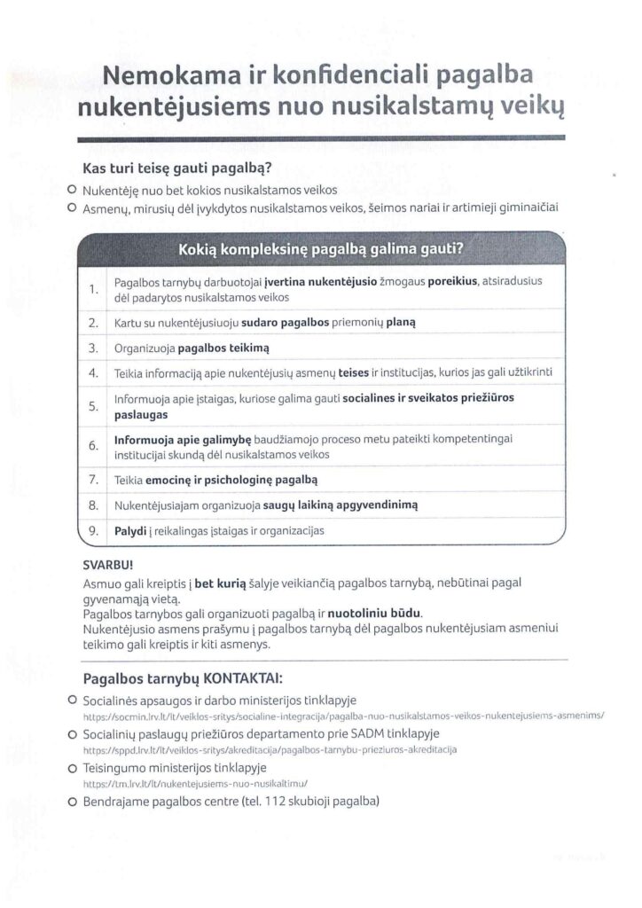 Lietuvos Respublikos socialinės apsaugos ir darbo ministerija (toliau – Ministerija) pateikia 2026 metais akredituotų pagalbos nuo nusikalstamos veikos nukentėjusiems asmenims organizuojančių ir teikiančių pagalbos tarnybų (toliau – pagalbos tarnyba) sąrašą bei atnaujintą kontaktinę informaciją.