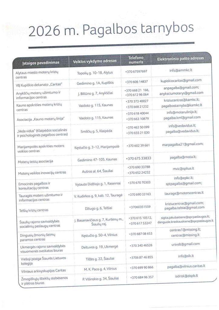 Išsamią informaciją apie pagalbos tarnybas rasite Ministerijos interneto svetainėje: Pagalbą teikiančios tarnybos 2026 m. – Lietuvos Respublikos socialinės apsaugos ir darbo ministerija.