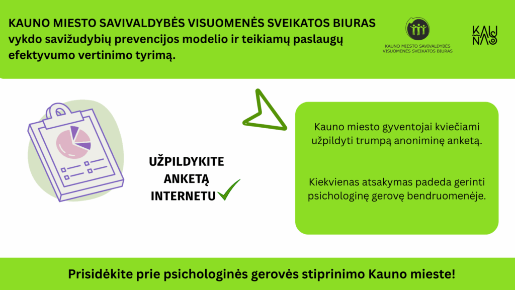 Kauno miesto savivaldybės visuomenės sveikatos biuras šiuo metu atlieka Kauno miesto savižudybių prevencijos modelio ir jo teikiamų paslaugų efektyvumo vertinimo tyrimą. Norime išgirsti Jūsų nuomonę apie Savižudybių prevencijos modelio pagalbos prieinamumą, informuotumą bei pastebėti vyraujančias nuostatas ir galimas baimes visuomenėje, susijusias su savižudybių tema bei kreipimusi pagalbos sunkumų metu. Kiekvieno Kauno miesto gyventojo požiūris mums yra labai svarbus – Jūsų atsakymai padės tobulinti teikiamas paslaugas ir kurti saugesnę bei labiau palaikančią bendruomenę.